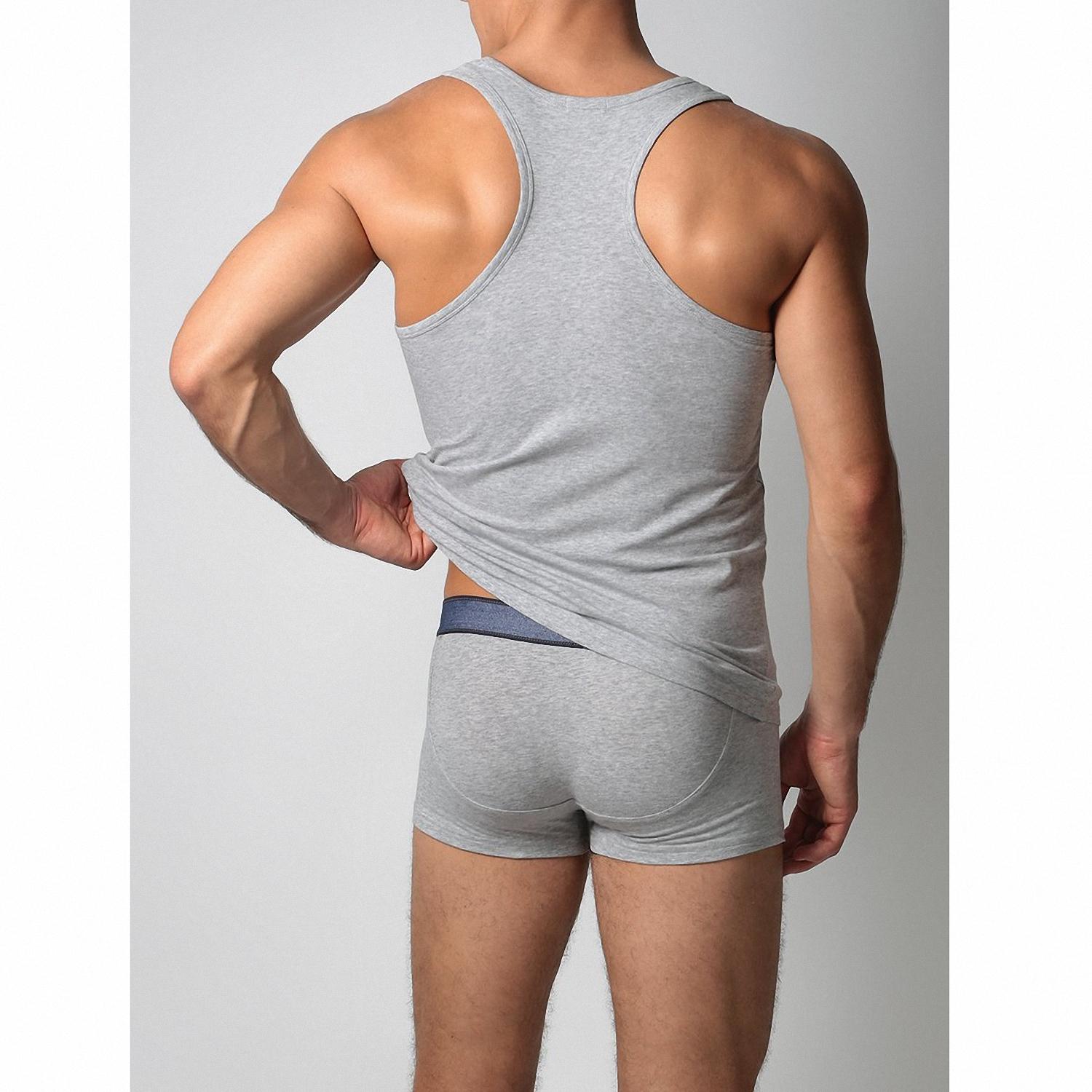Классическая мужская майка-борцовка сделана из трикотажа на основе хлопка с добавлением эластана. Модель с широкими лямками дополнена круглым вырезом.