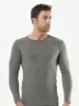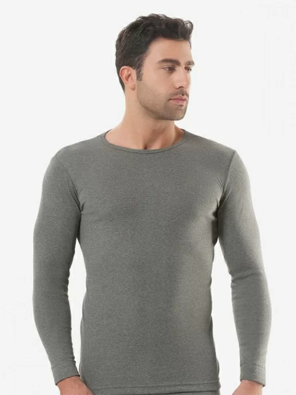 Однотонная мужская фуфайка прилегающего силуэта, выполненная в меланжевой расцветке. Модель имеет высокий круглый вырез горловины и длинный рукав.