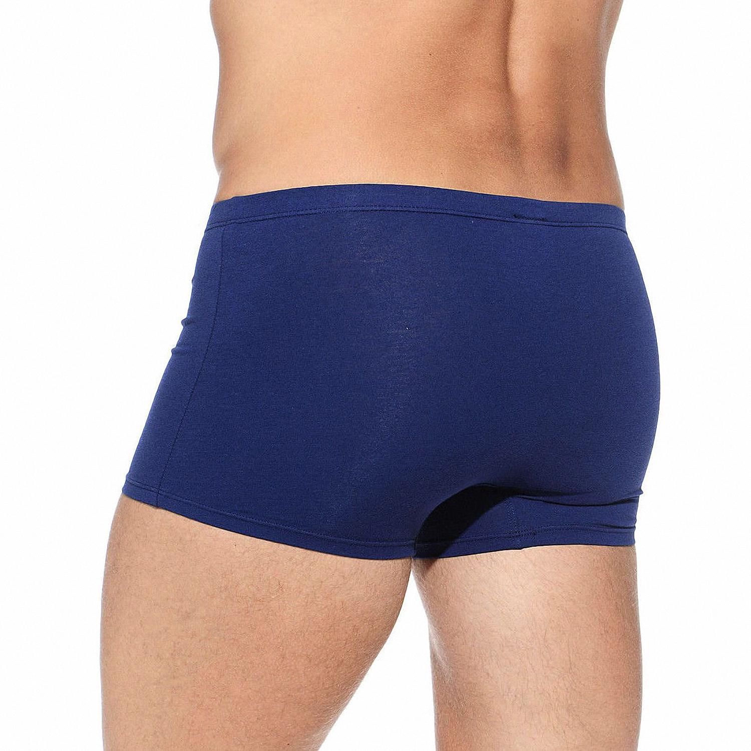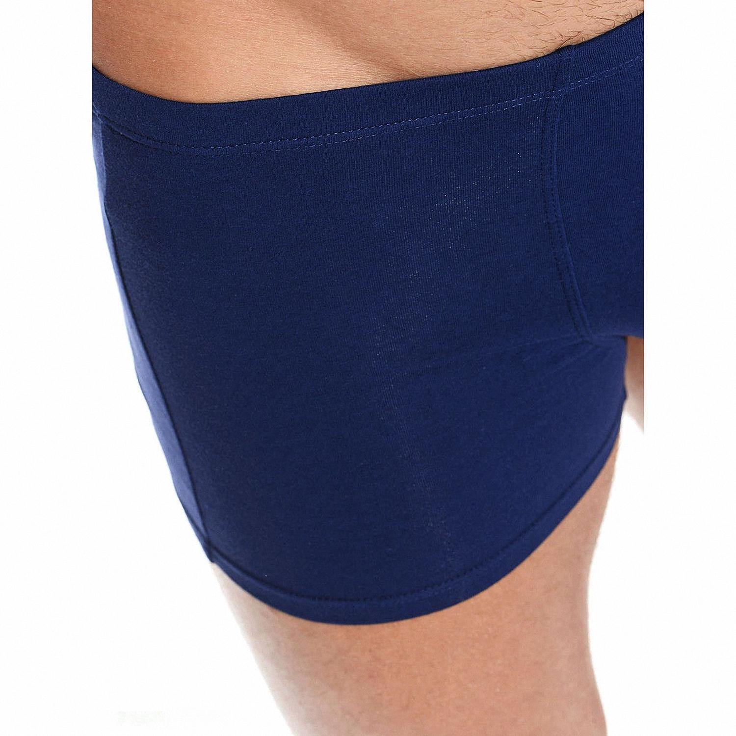 Удобные хлопковые трусы-шорты для мужчин. Материал мягкий, цвет темно-синий, однотонный. Подходят для ежедневного использования. Широкая резинка удобная и плотная, не перетягивает кожу. На поясе имеется логотип бренда изделия.