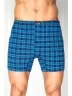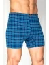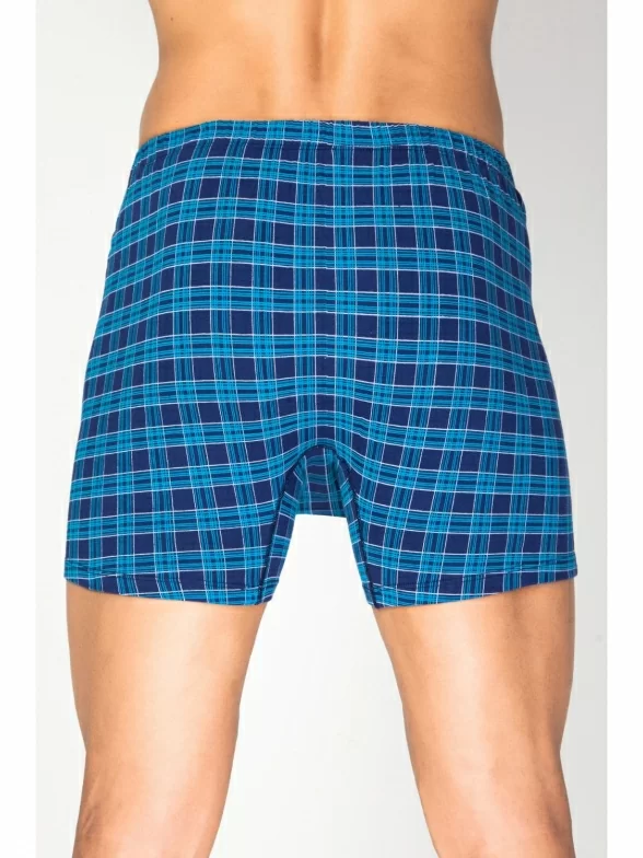Мужские обтягивающие трусы сшиты из синего хлопкового трикотажа в крупную клетку. Плоские швы между ног не раздражают кожу во время ходьбы. Широкий эластичный пояс украшен аппликацией с названием марки.