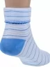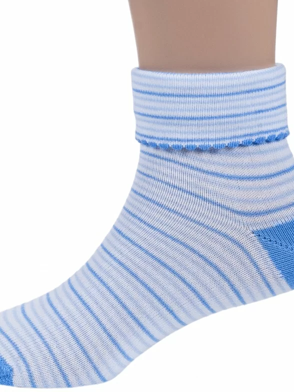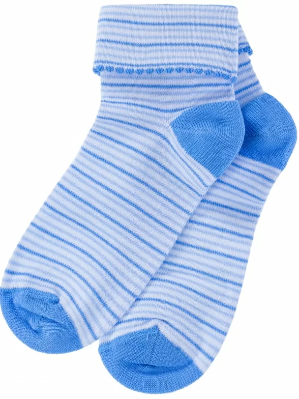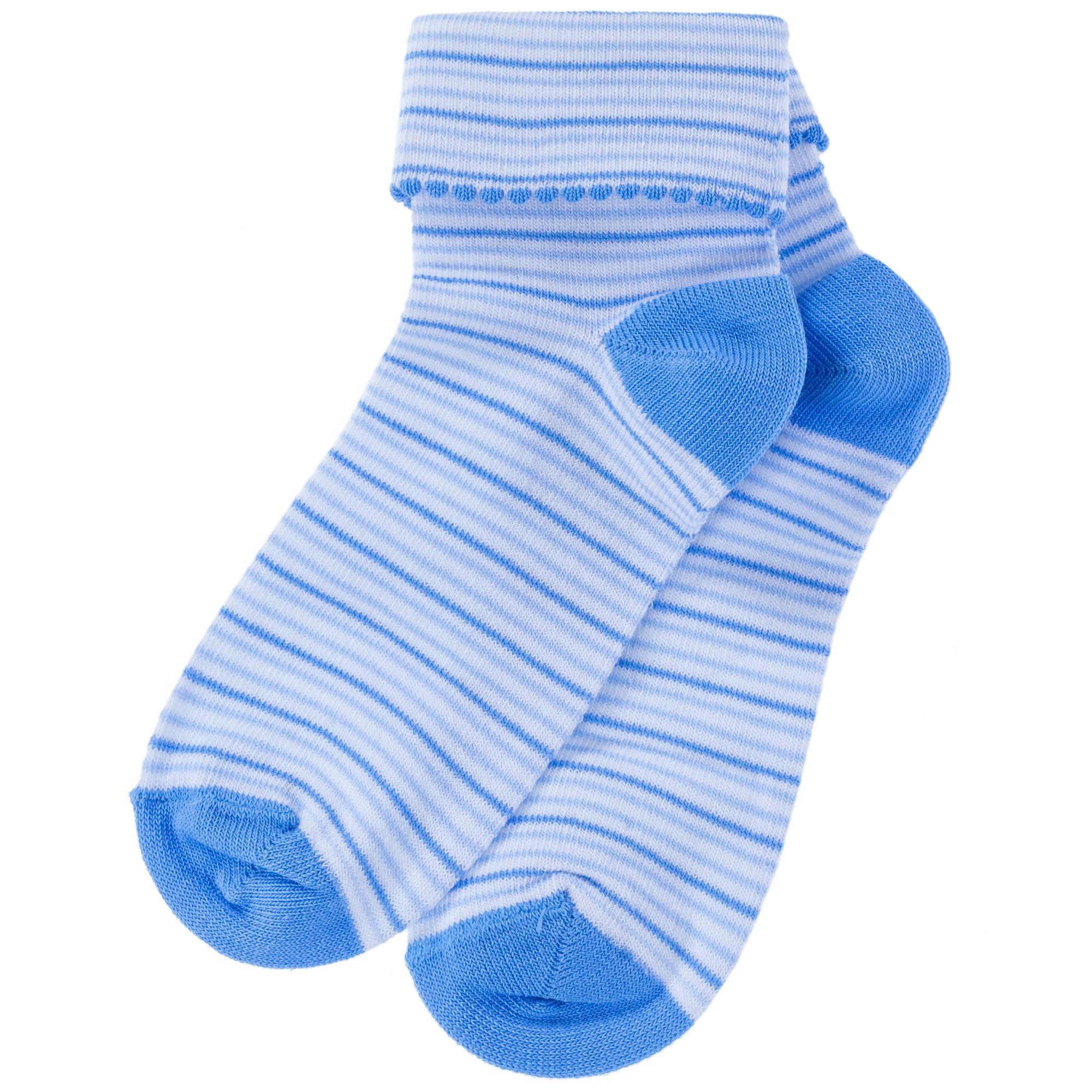 Круглогодичные укороченные детские носки, цвет голубой, повседневные, с отворотом, возможно бесшовные, принт (рисунок): полоски, контрастные пятка / мысок / резинка, с узором, состав: 90% хлопок, 7% полиамид, 3% эластан (лайкра), арт. П4. Производитель «ИП Мурзаков В.А., Ставропольский край, Россия» под брендом «Lorenzline».