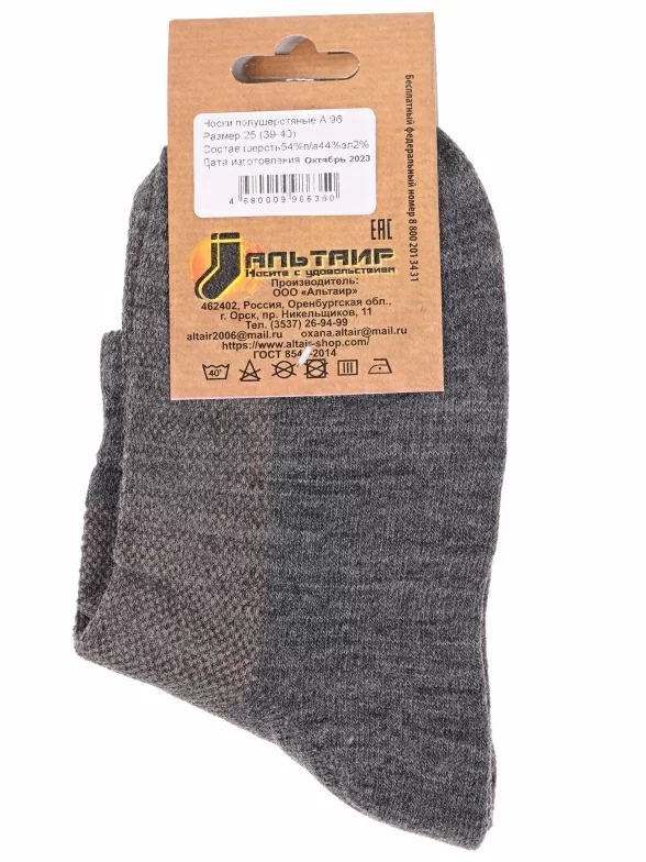 Зимние укороченные носки унисекс, цвет серый, теплые, шов обычный (не бесшовные), принт (рисунок): однотонный, без рисунков/узоров, с узором, состав: 54% шерсть, 44% полиамид, 2% эластан, арт. А96. Производитель «ООО Альтаир, г. Орск, Оренбургская обл, Россия» под брендом «Альтаир».