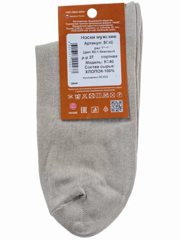 Мужские носки из 100% хлопка "НАШЕ" Смоленской чулочной фабрики, 5С40, рис. 1, БЕЖЕВЫЕ №52-1