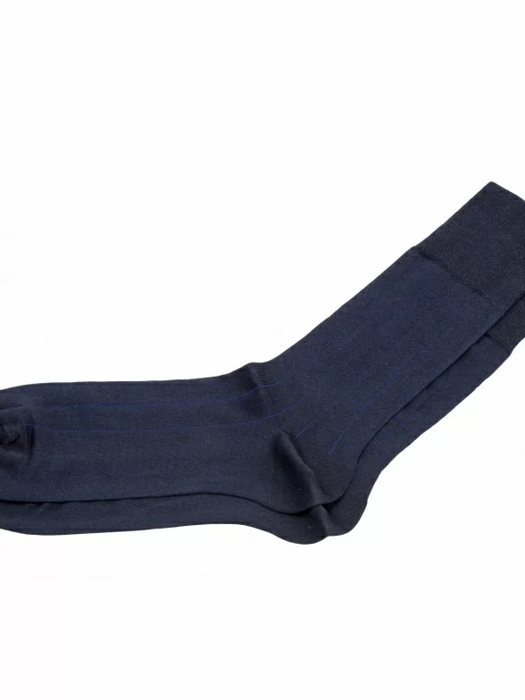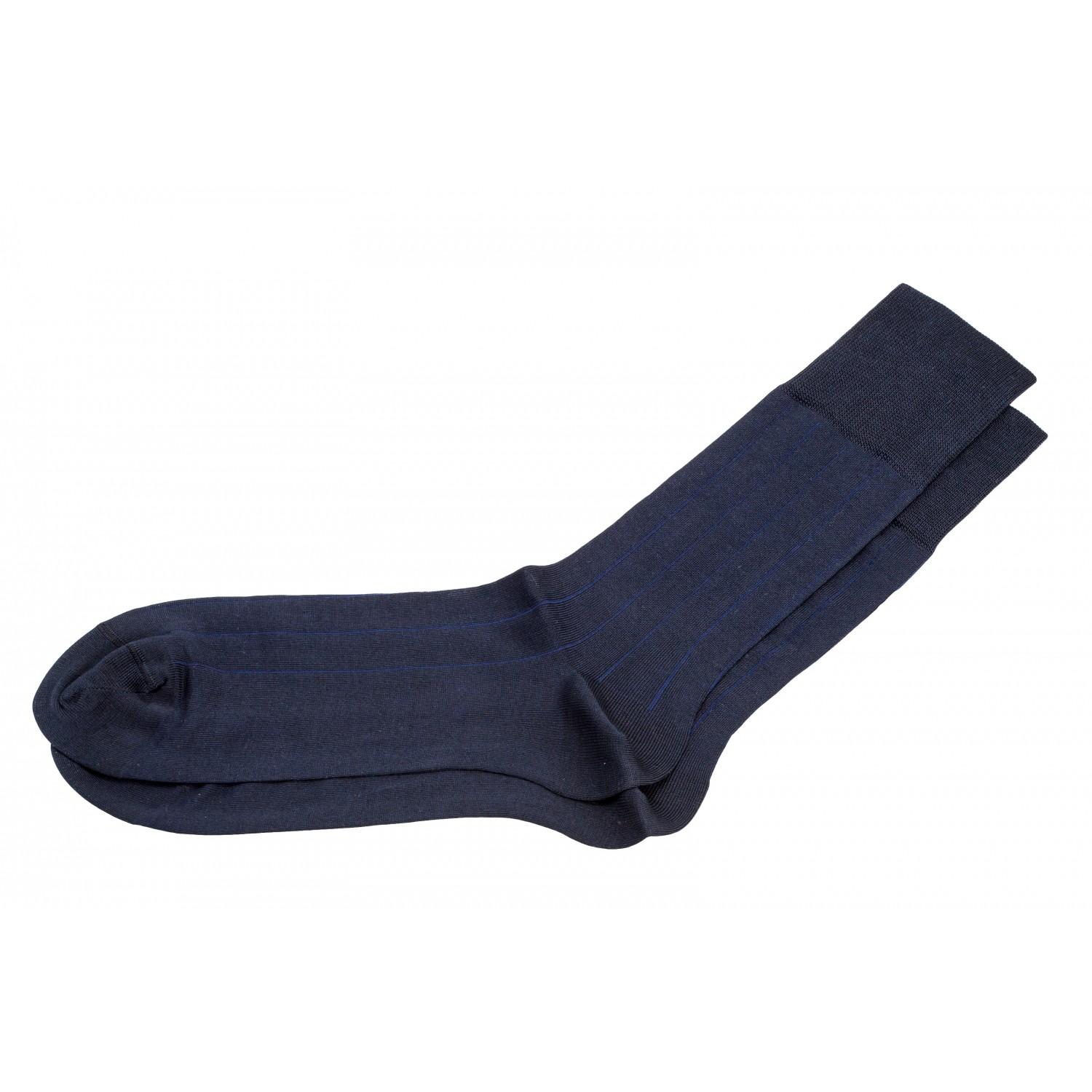 Мужские носки классической длины, оформленные тонкими контрастными вертикальными полосками. Модель изготовлена из премиального трикотажа на основе мерсеризованного хлопка, который придает носкам повышенную износостойкость и особую гладкую фактуру. Высокая резинка распределяет нагрузку на сосуды.