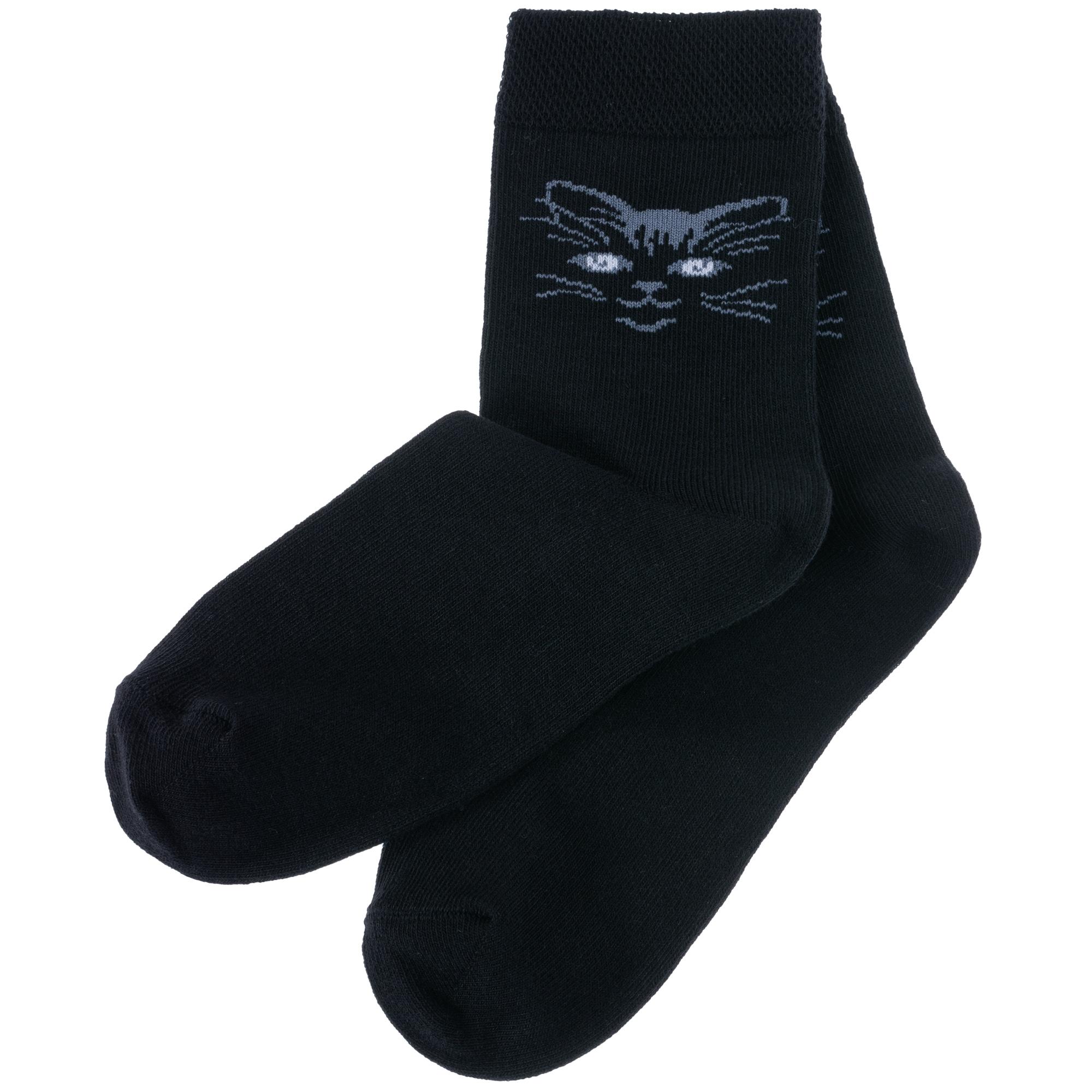Детские носки, связанные из хлопка с добавлением полиамида и эластана, украшены рисунком в виде кошачьей мордочки. Модель произведена Брестким Чулочным комбинатом.