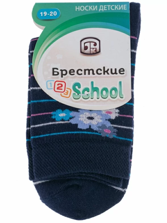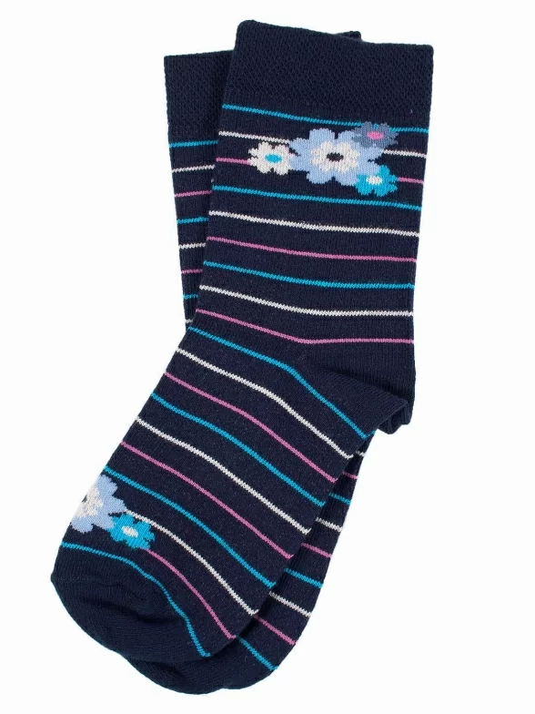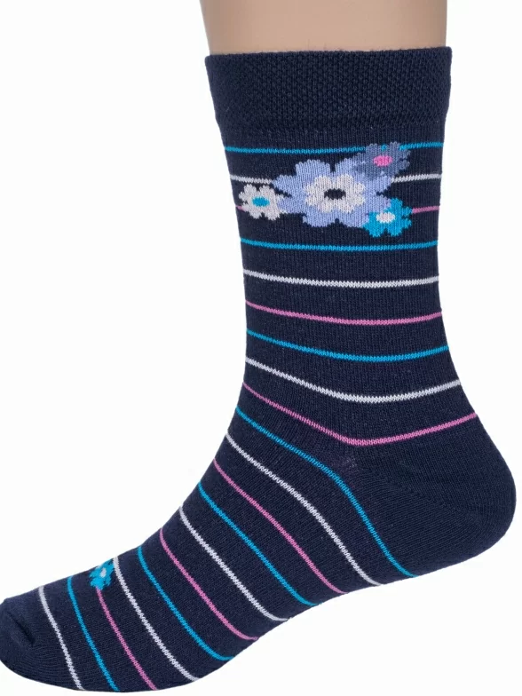Детские носки от Брестского чулочного комбината украшены принтом в полоску и цветочным рисунком. Модель, дополненная широкой резинкой, связана из хлопка с добавлением полиамида и эластана.