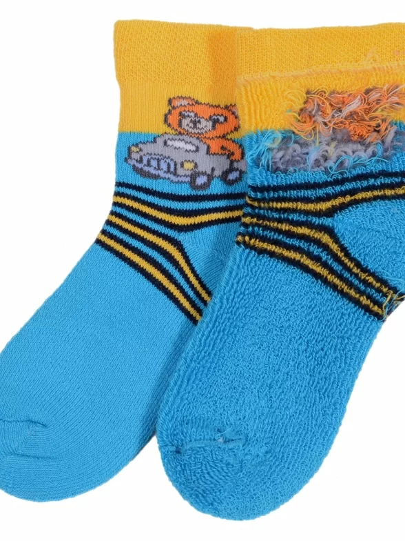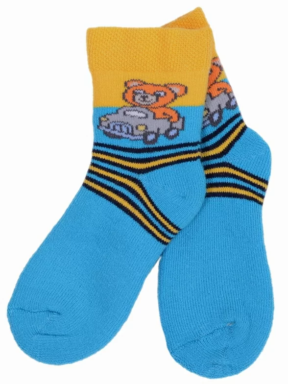Мягкие махровые носки из приятного хлопка. Они очень удобные и обеспечивают комфортный микроклимат. Сочетание двух цветов и яркий принт обязательно порадуют ребенка.