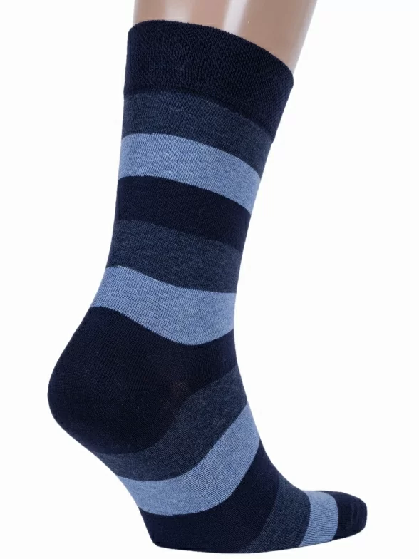 Удобные хлопковые носки с расцветкой в широкую контрастную полоску. Они связаны из качественного полотна н основе мягкого хлопка. Носки обеспечивают комфортный микроклимат и не передавливают сосуды, а дизайн модели хорошо сочетается с Casual одеждой.