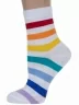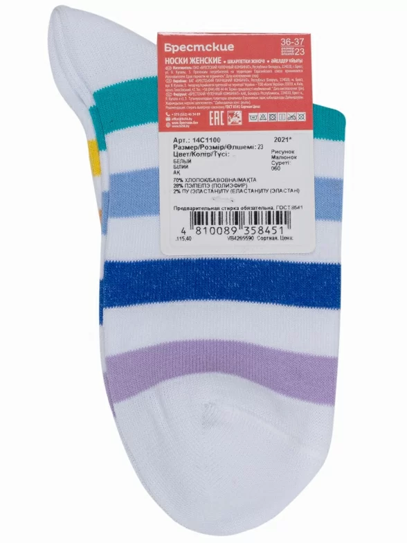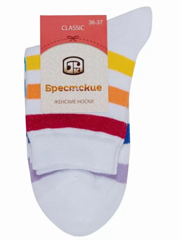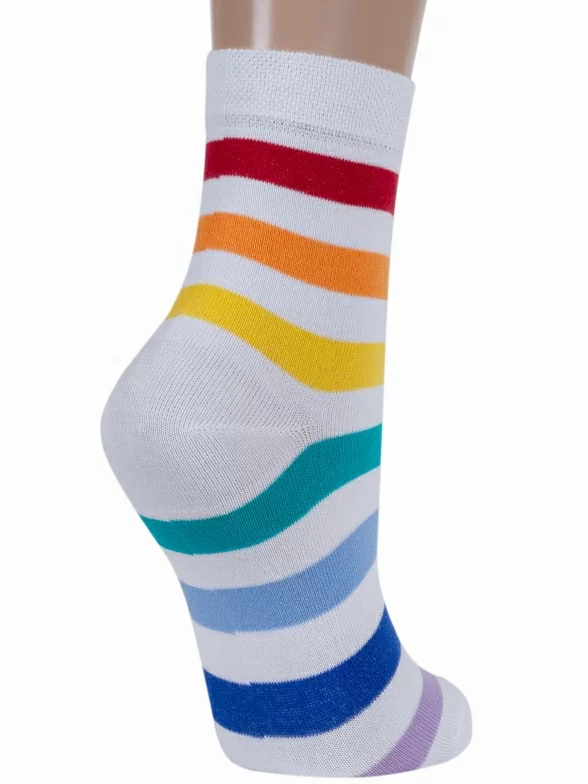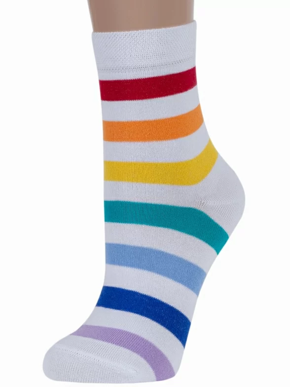 Очень стильные женские носки слегка укороченного фасона. Широкие разноцветные полоски на белом фоне смотрятся очень оригинально, поэтому модель отлично сочетается с яркой одеждой, подчеркивая образ. Носки очень приятны к телу и отлично подходят как для спортивной, так и для повседневной обуви.