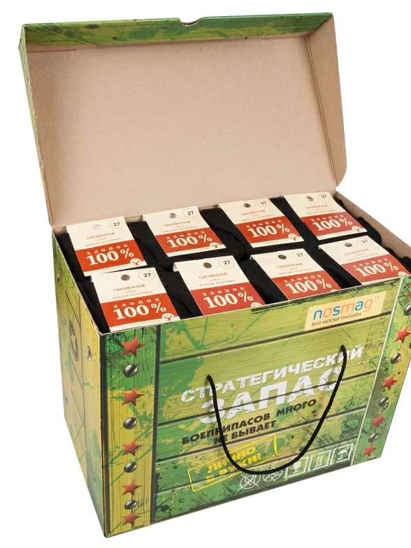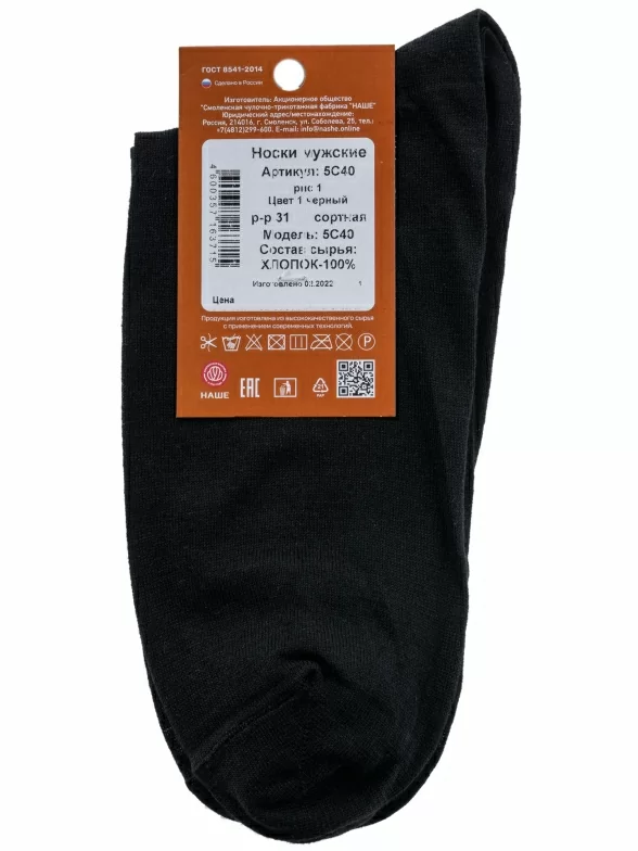 В набор входит 100 пар черных носков артикула 5С40 с индивидуальными фабричными этикетками, упакованы в большой фирменной коробке и для сохранности дополнительно в плотном транспортном картоне.