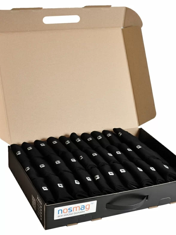 Носки с фабричными этикетками компактно уложены в фирменный кейс, дополнительно упакованы в плотный транспортный картон.