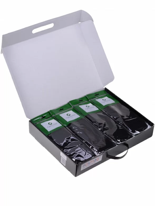 Набор состоит из 30 пар черных носков артикула 15D7, сложенных с индивидуальными фабричными этикетками в фирменный кейс, который дополнительно упакован в плотный транспортный картон для сохранности при доставке.