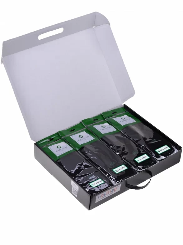 Набор состоит из 30 пар черных носков артикула 15D11, сложенных с индивидуальными фабричными этикетками в фирменный кейс, который дополнительно упаковывается в плотный транспортный картон для сохранности при доставке.