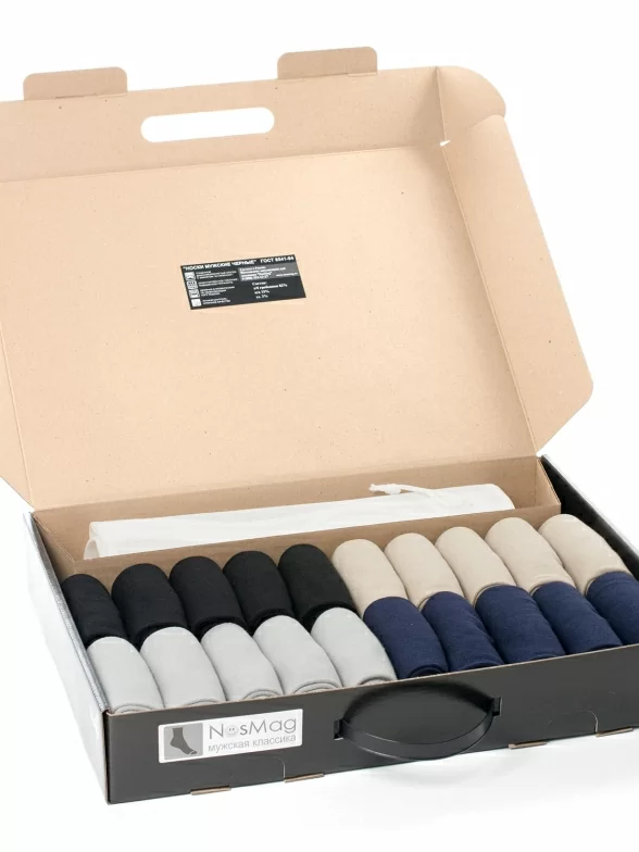 В набор входит 20 пар однотонных мужских носков бренда RuSocks и сеточный мешок для стирки на молнии.