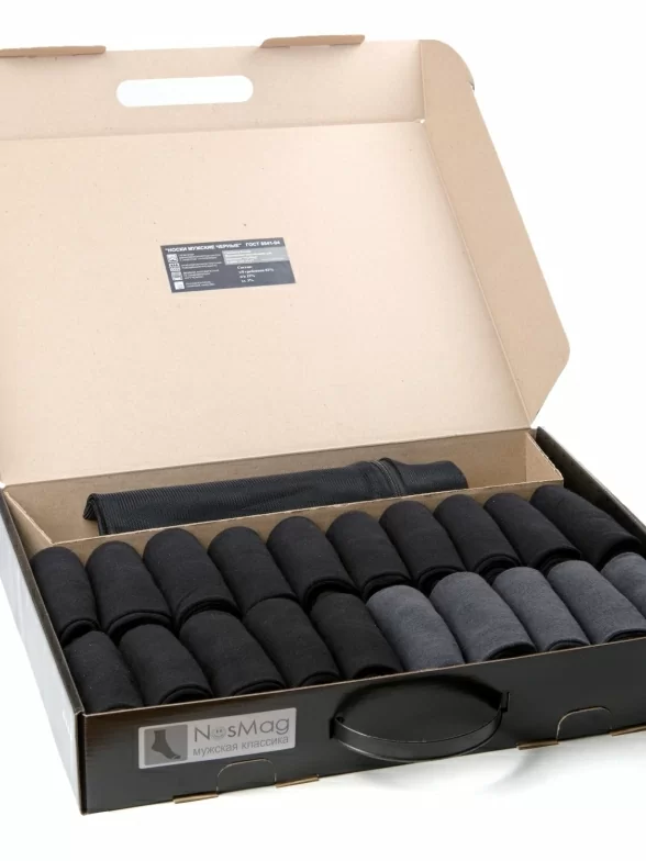 В набор входит 20 пар однотонных мужских носков бренда RuSocks и сеточный мешок для стирки на молнии.