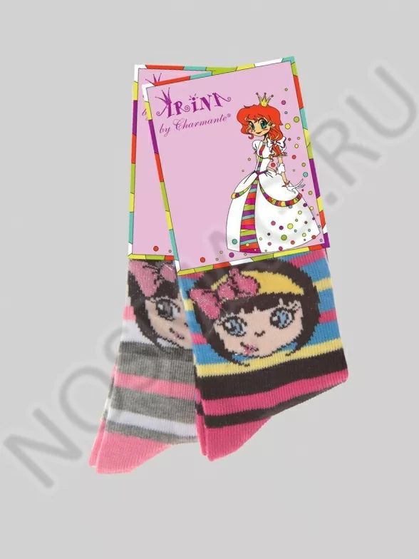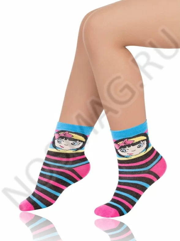 Яркие разноцветные носки для девочек. Они украшены разноцветными полосками, а ближе к резинке на них нанесён принт с весёлой девочкой. Контрастные пятка и носок подчёркивают расцветку модели.