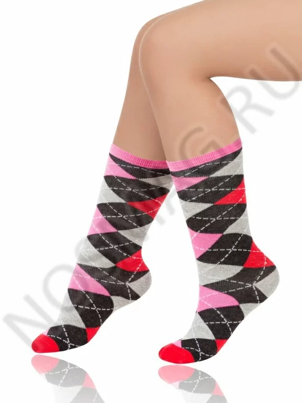Стильные гольфы с геометрическим разноцветным узором. Эта красочная, модная и очень оригинальная модель обязательно станет одной из любимых в гардеробе любой девочки!