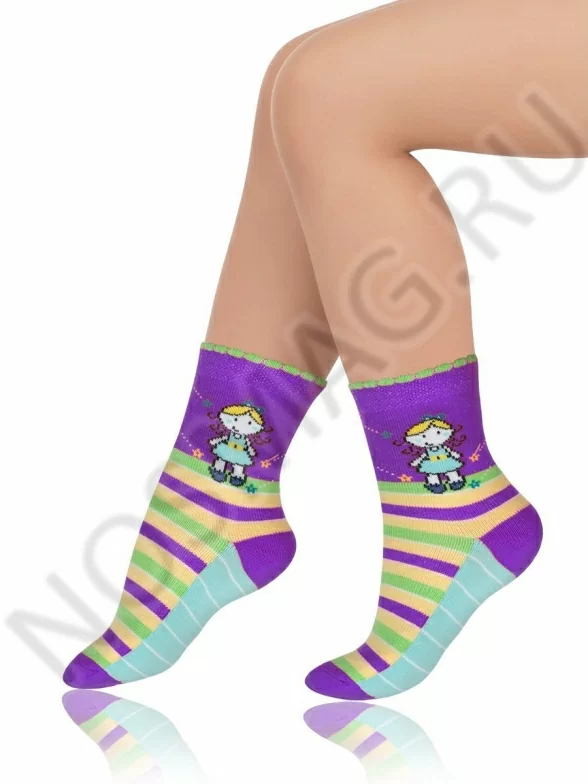 Очень яркие носки для девочек, украшенные насыщенными разноцветными полосками и рисунком с весёлой девочкой. Модель отличается анатомическим фасоном и удобной, не сдавливающей кожу резинкой.