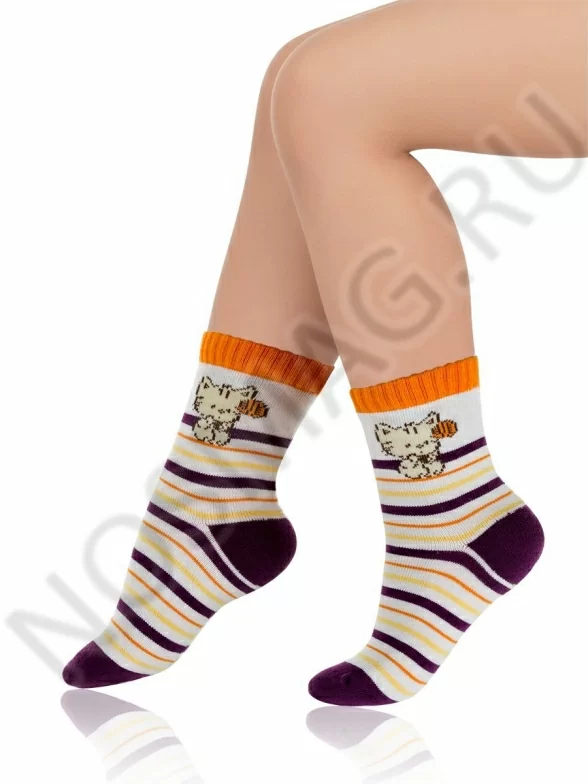 Очень красивые носки в полоску для девочек, украшенные изображениями милых котят. Специальные трикотажные манжеты позволяют им отлично держаться, не сдавливая кожу ребёнка.