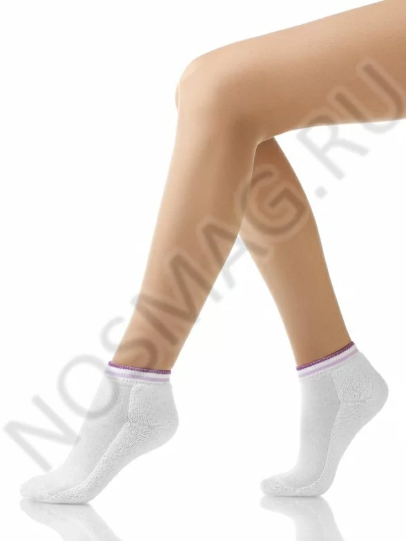 Удобные носочки укороченной длины для девочек. Носок, пятка и низ ступни модели сделаны из плотного махрового материала, благодаря чему данные носки очень удобны для дома и на выход. Трикотажные манжеты украшены полосками.