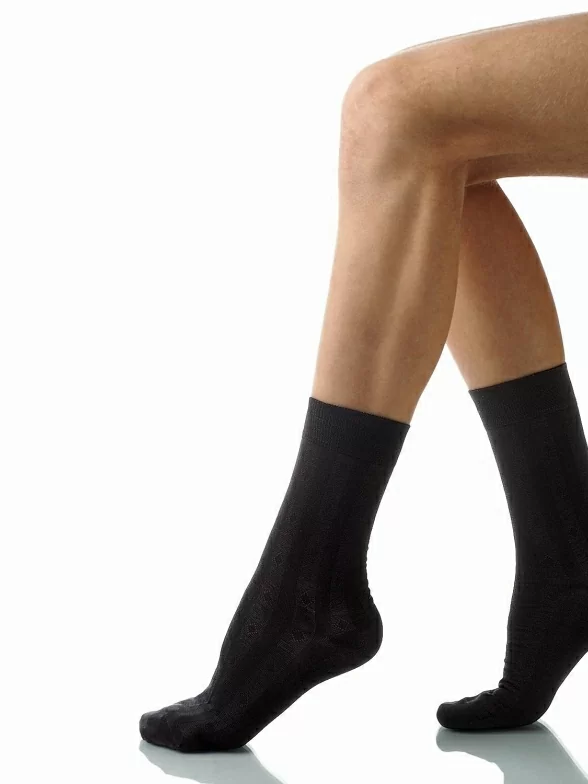 Тонкие эластичные мужские носки из хлопка. Модель имеет анатомическую форму. Чередующиеся полоски с менее плотной вязкой, украшены ромбами.