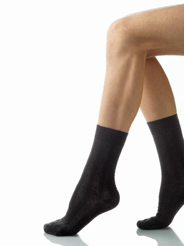 Тонкие эластичные мужские носки из хлопка. Модель имеет анатомическую форму. Чередующиеся полоски с менее плотной вязкой, украшены ромбами.