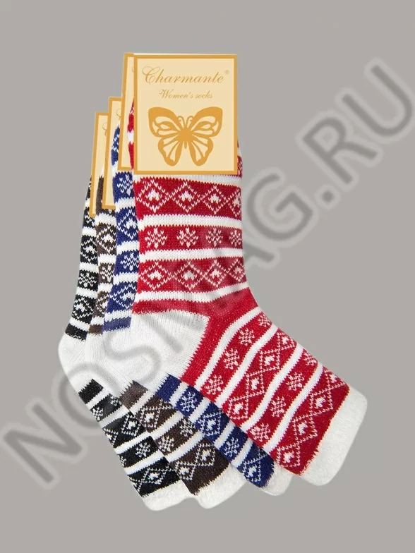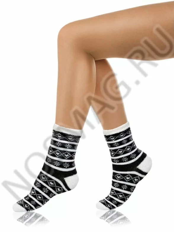 Тёплые женские домашние носки классической длины, выполненные в скандинавском стиле с характерным зимним узором. Модель с плоскими швами и мягкой резинкой. Почувствуйте себя в гостях у Санты!