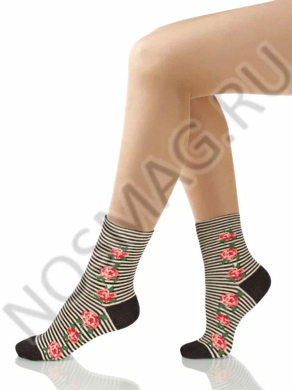 Женские носки, в составе которых имеется натуральная шерсть. Модель отличает оригинальная расцветка: контрастные полоски, в сочетании с цветочным принтом.