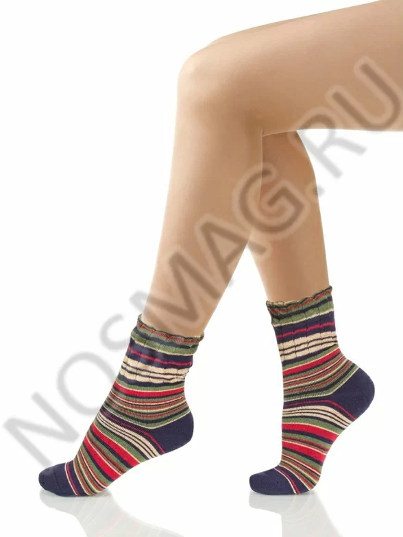 Стильные женские носки в разноцветную полоску. Они имеют анатомическую форму, а мягкая резинка не сдавливает кожу. Декоративные сборки на резинке подчёркивают дизайн носков.