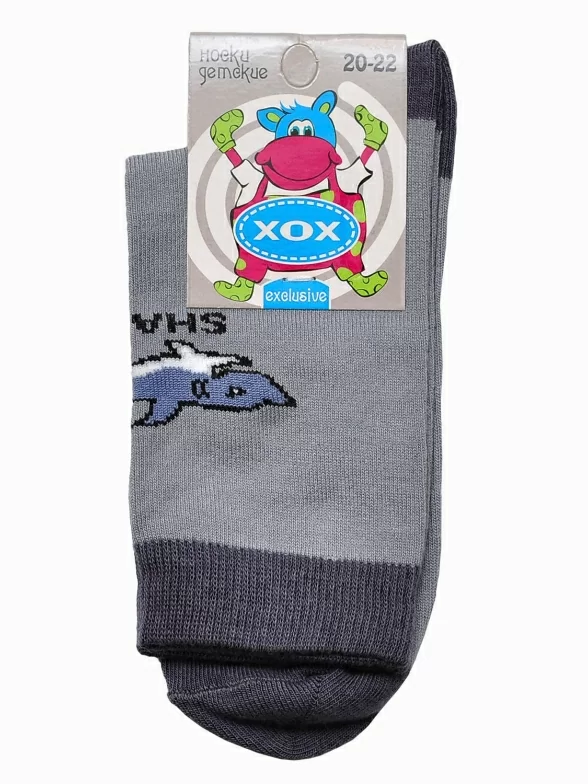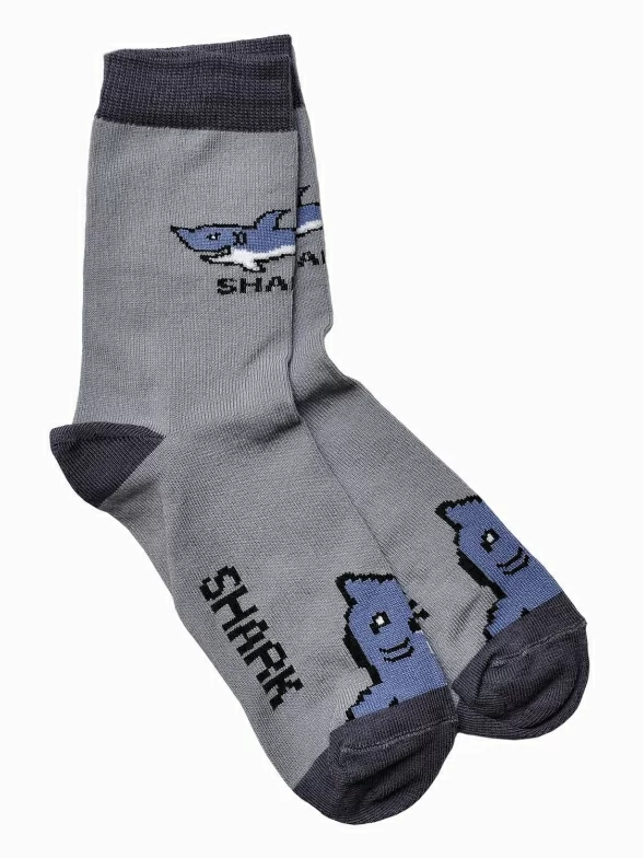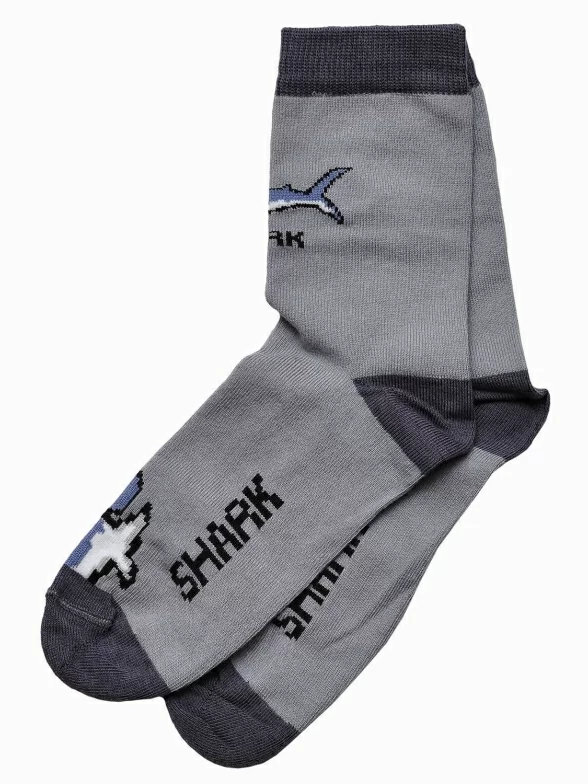 Серые демисезонные носки с рисунком акулы. Модель хорошо сидит на ноге, а удобная резинка подарит малышам комфорт и будет приятна к телу. Носки на 88% состоят из хлопка, что способствует естественной циркуляции воздуха.