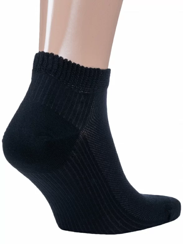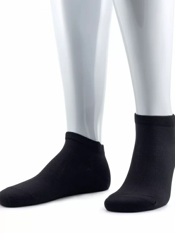 Короткая модель с плоским малоощутимым швом на мыске, сетчатой вязкой на подъеме стопы и с двойным бортом (манжетом резинки).