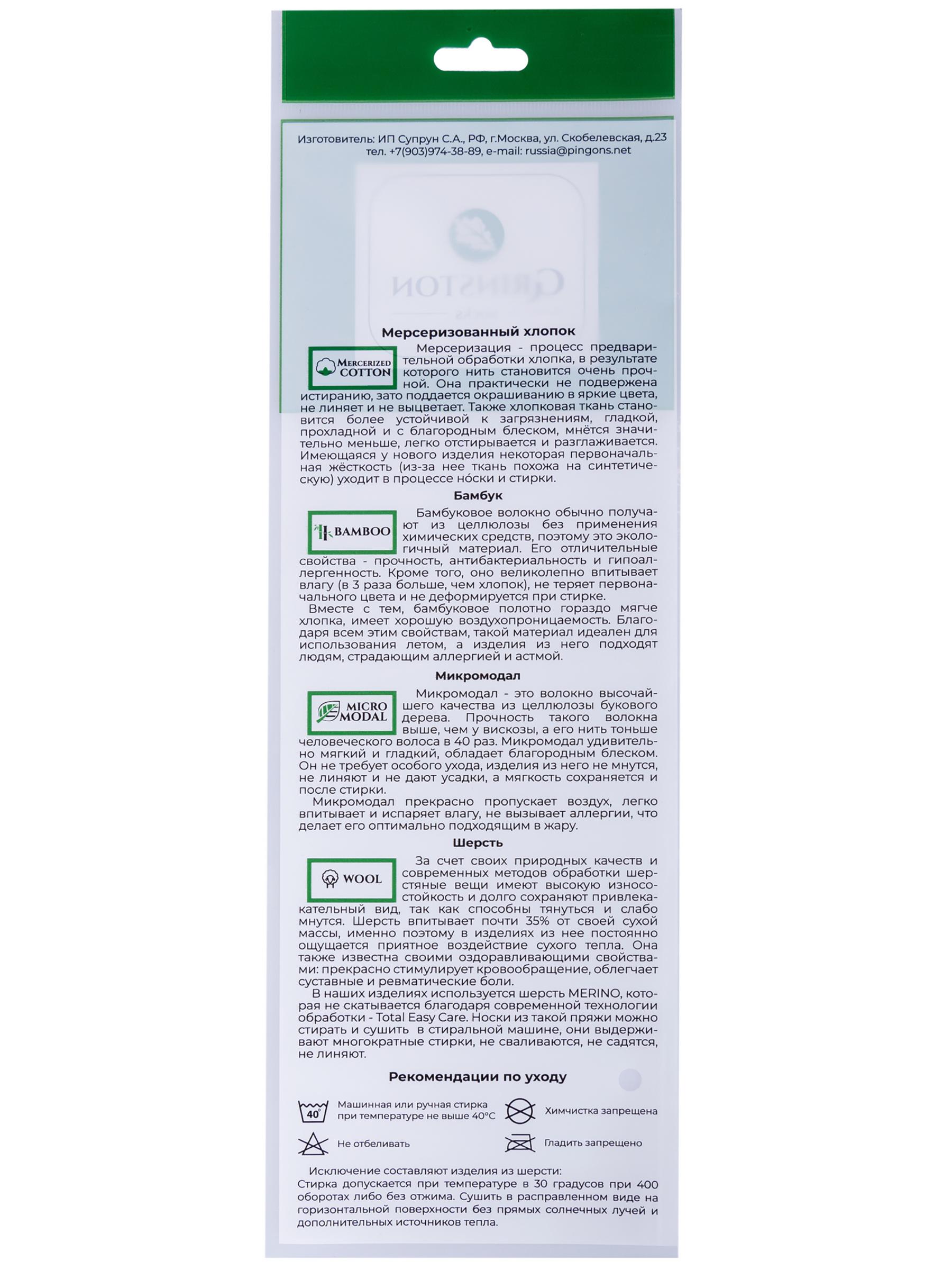 Связаны из микромодального волокна - гладкого тонкого материала, обладающего такими свойствами как гипоаллергенность, воздухопроницаемость и гигроскопичность (способность впитывать и испарять влагу). Еще одна особенность такого материала - его нежность и шелковистость, он приятнее даже мягкого бамбука, но прочнее. А добавленный полиамид делает изделие еще более износостойким. В носках с таким составом будет комфортно даже в жаркую погоду за счет высокой циркуляции воздуха и влаги. Процентное соотношение волокон: 90% микромодал, 10% полиамид.