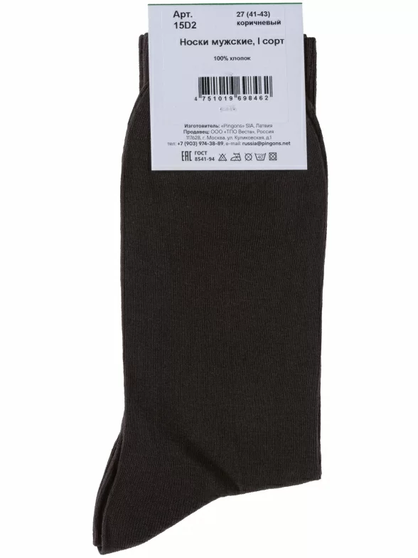 Пара коричневых носков артикула 15D2 с фабричной этикеткой поставляется в прозрачном пакете с дополнительной транспортной упаковкой.
