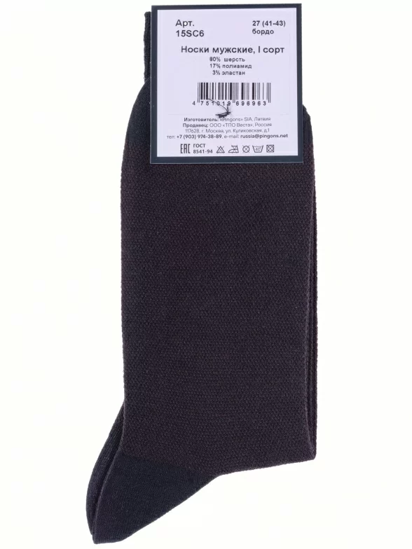 Пара бордовых носков артикула 15SC6 с фабричной этикеткой поставляется в прозрачном пакете.