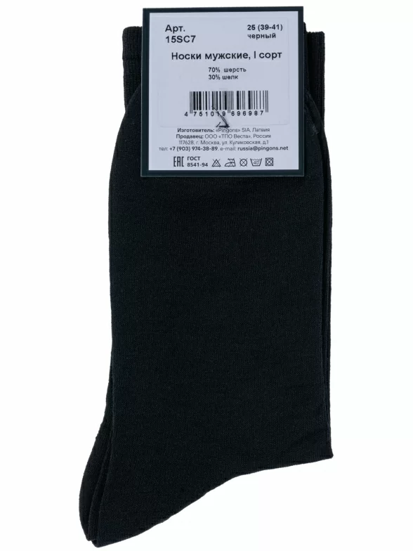 Пара черных носков артикула 15SC7 с фабричной этикеткой поставляется в прозрачном пакете с дополнительной транспортной упаковкой.