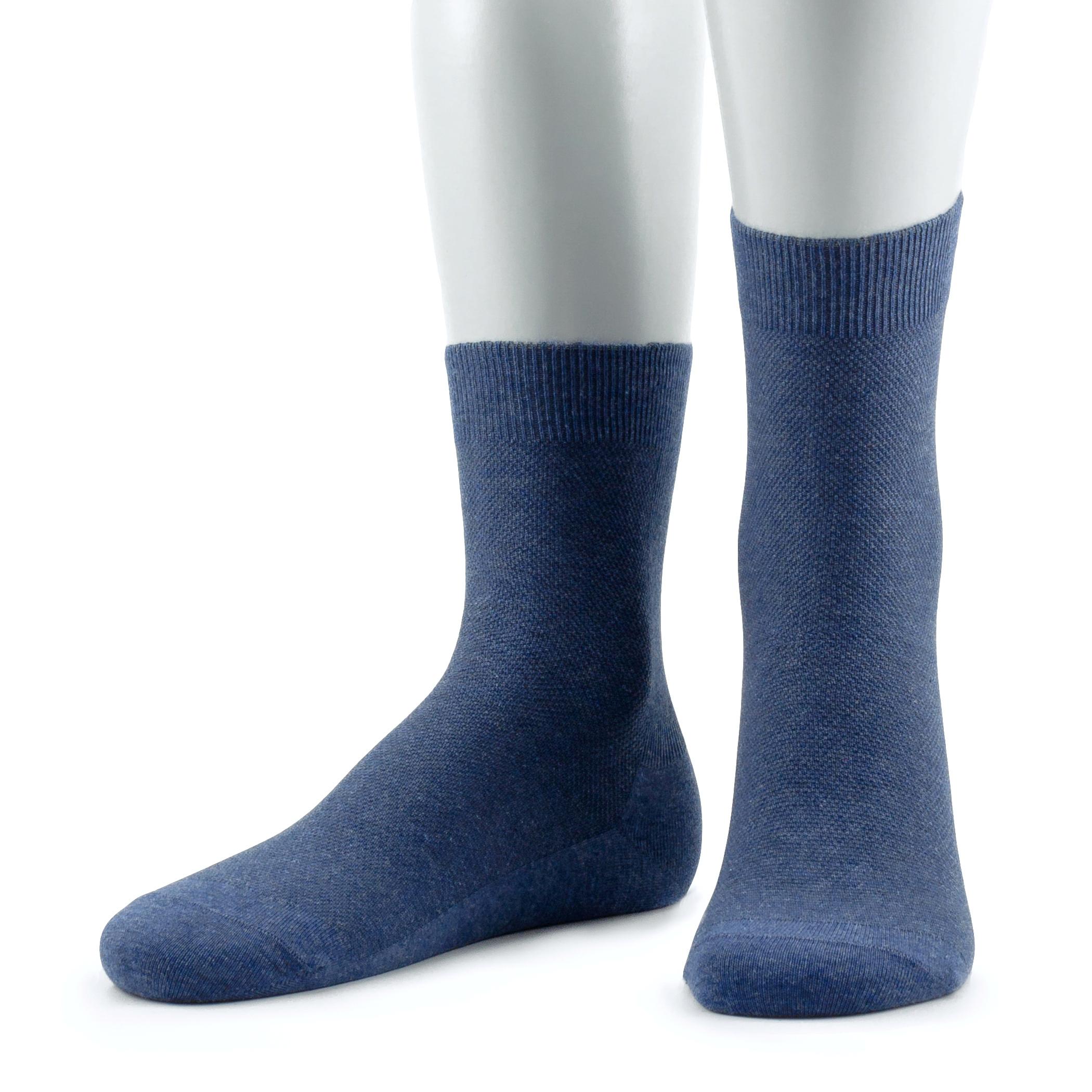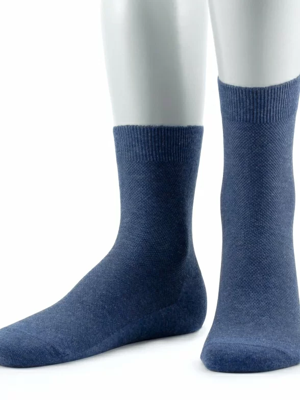 Однотонная модель средней длины с плоским малоощутимым швом на мыске и без резинки, благодаря чему носки не пережимают ногу и не нарушают кровообращение. Задняя часть паголенка связана в мелкий рубчик, что обеспечивает надежную фиксацию носка на ноге, а передняя часть, начиная с подъема стопы, имеет сеточную вставку жаккардового плетения, улучшая воздухообмен.