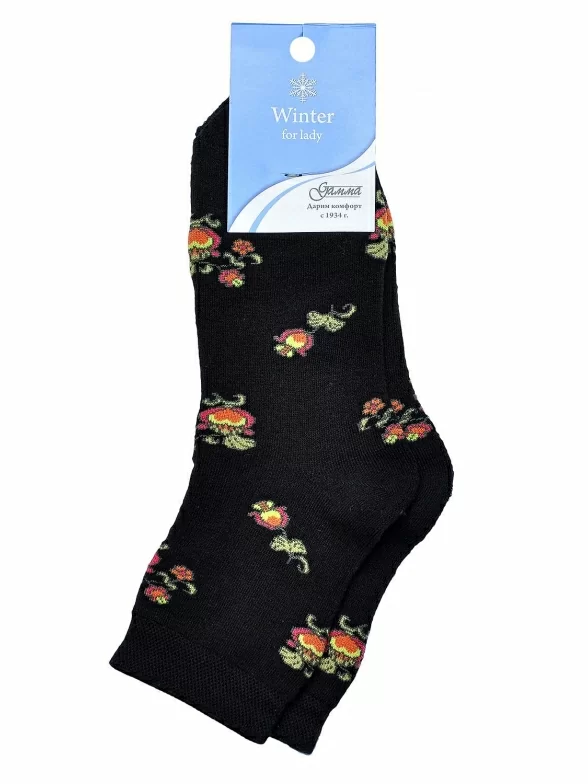 Женские махровые носки "Гамма", С840, ЧЕРНЫЕ / ЦВЕТЫ