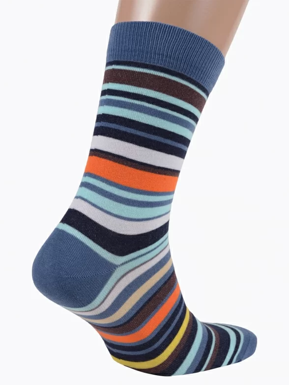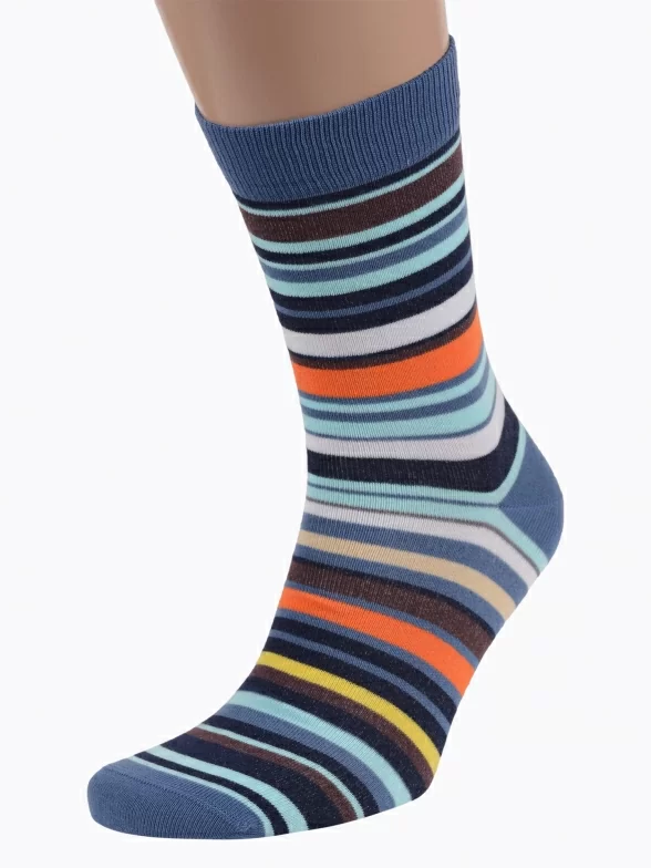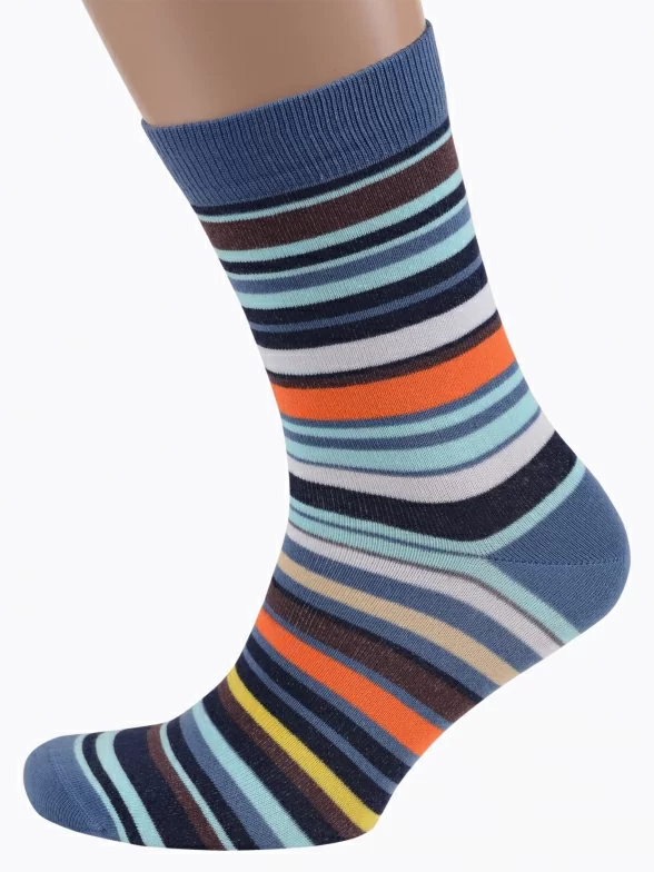 Яркие мужские носки классической длины. Они оформлены цветными полосками различной ширины и отличаются оптимальной плотностью. Качественный трикотаж с высоким процентом содержания натурального хлопка делает их невероятно комфортными в носке и обеспечивает хорошую износостойкость.
