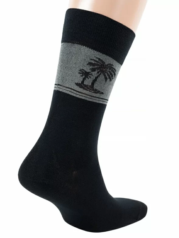 Удобные мужские носки классической длины. Они изготовлены из вискозы и декорированы принтом с пальмой. Модель имеет удобные трикотажные манжеты.