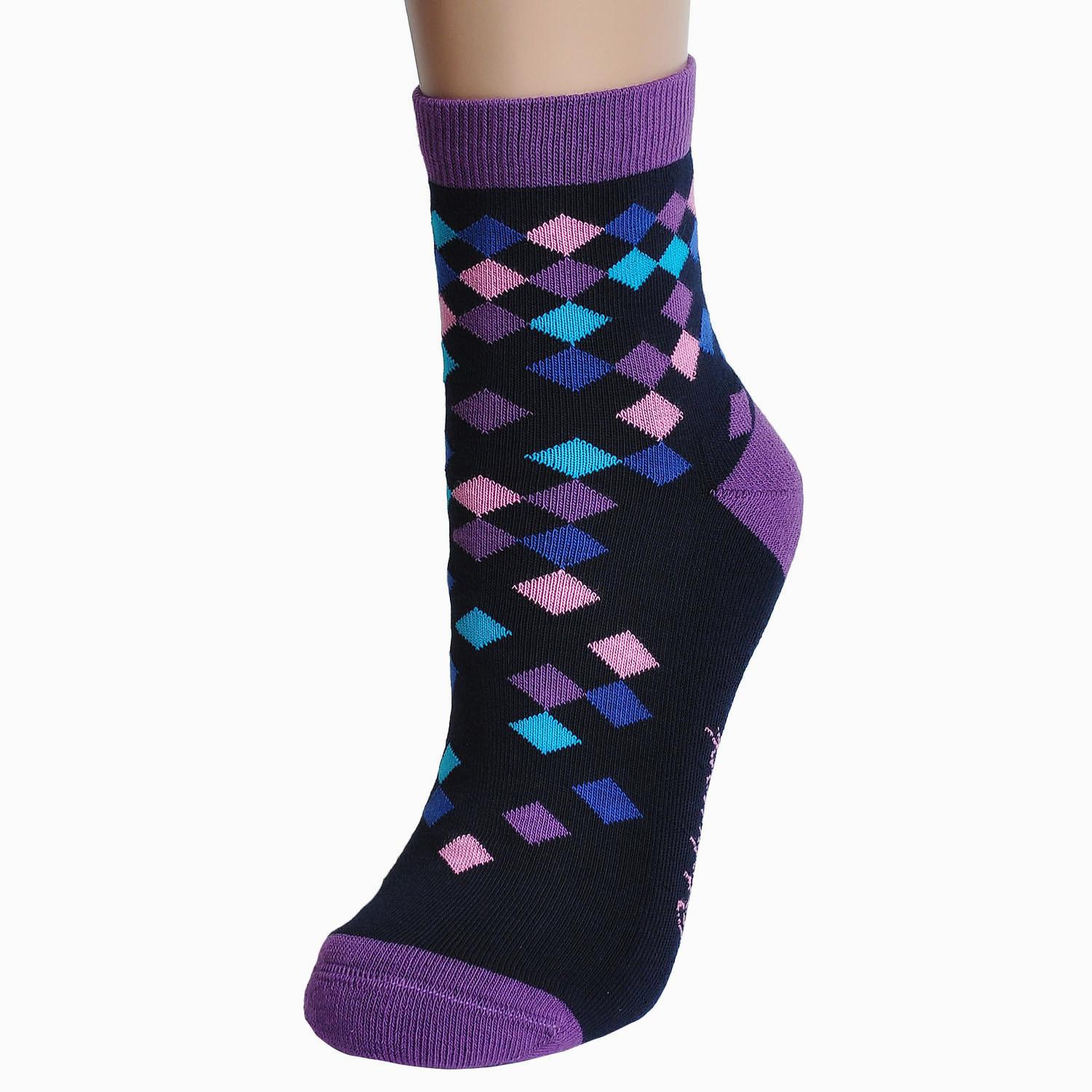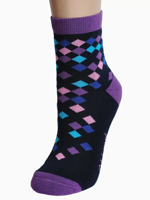 Махровые женские носки, оформленные узором в виде разноцветных ромбов. Пятка, резинка и мысок – контрастные. Носки обеспечивают комфорт и тепло и отлично подходят как для ношения дома в холодную погоду, так и на выход.