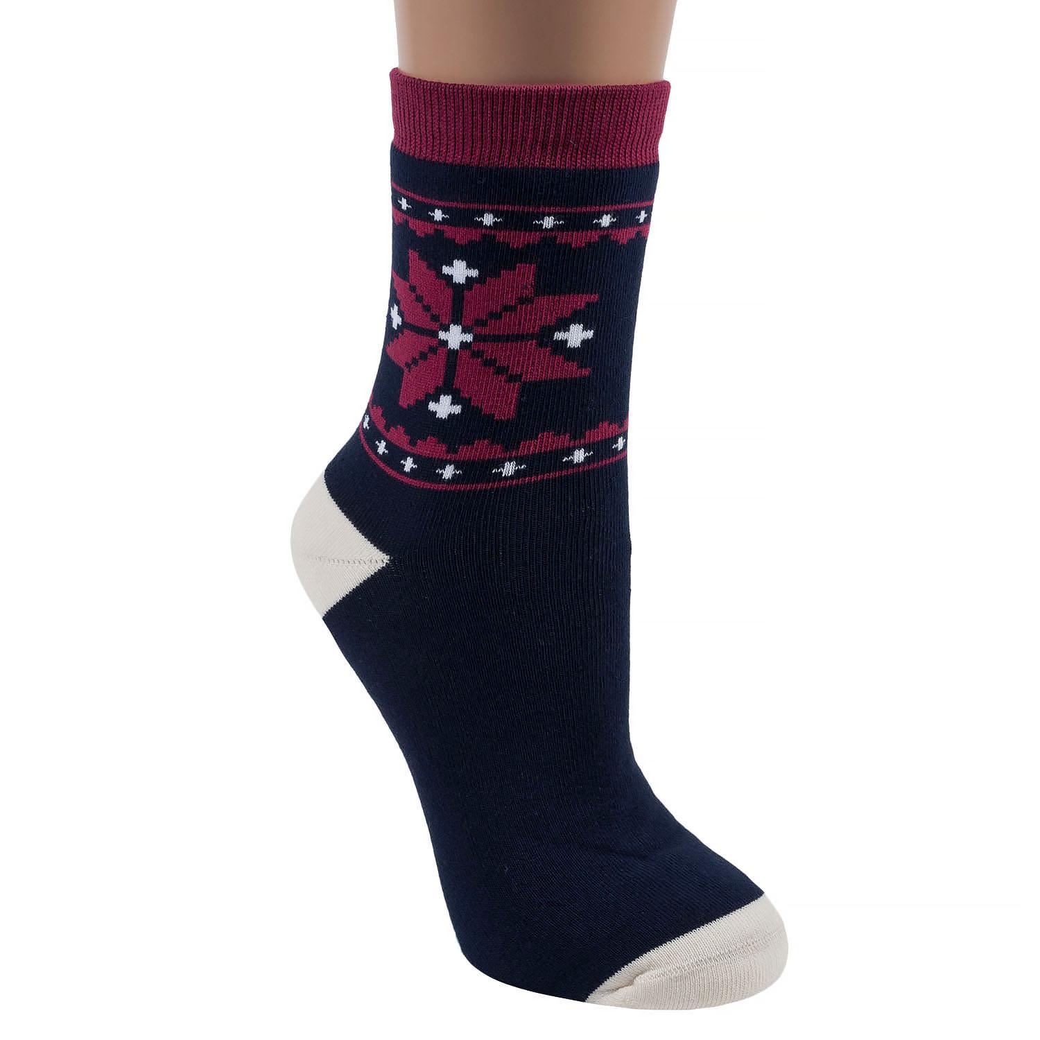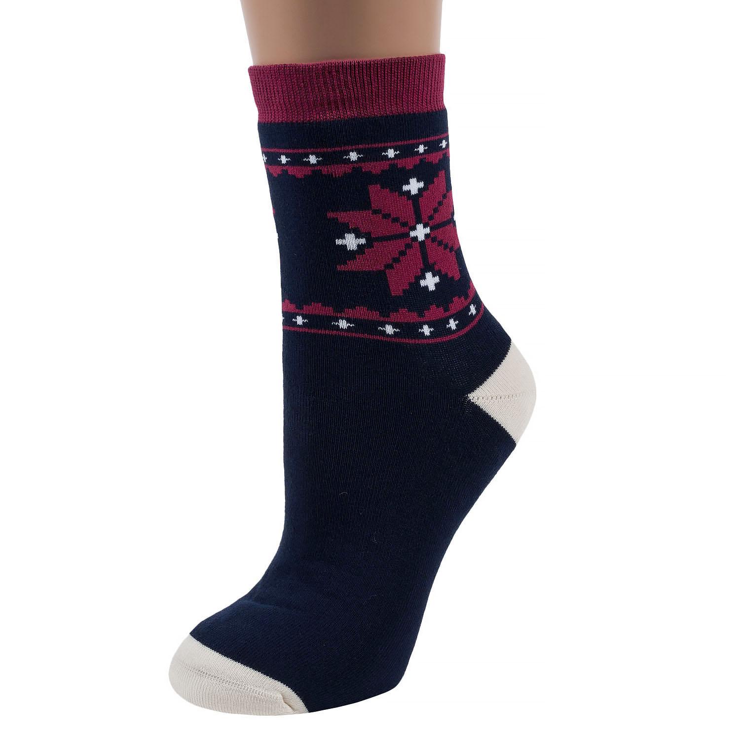 Удобные махровые носки для женщин. Модель обеспечивает тепло и комфорт. Носки оформлены узором в скандинавском стиле, который выгодно подчеркивают контрастные детали – мысок и пятка. Мягкая трикотажная резинка не создает излишнего давления.