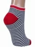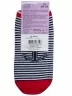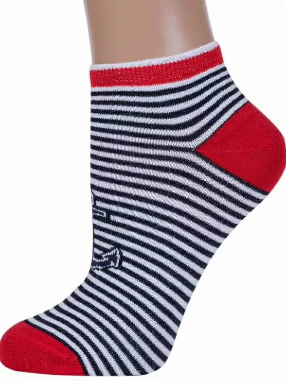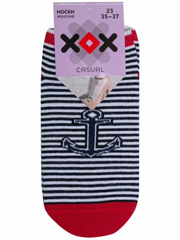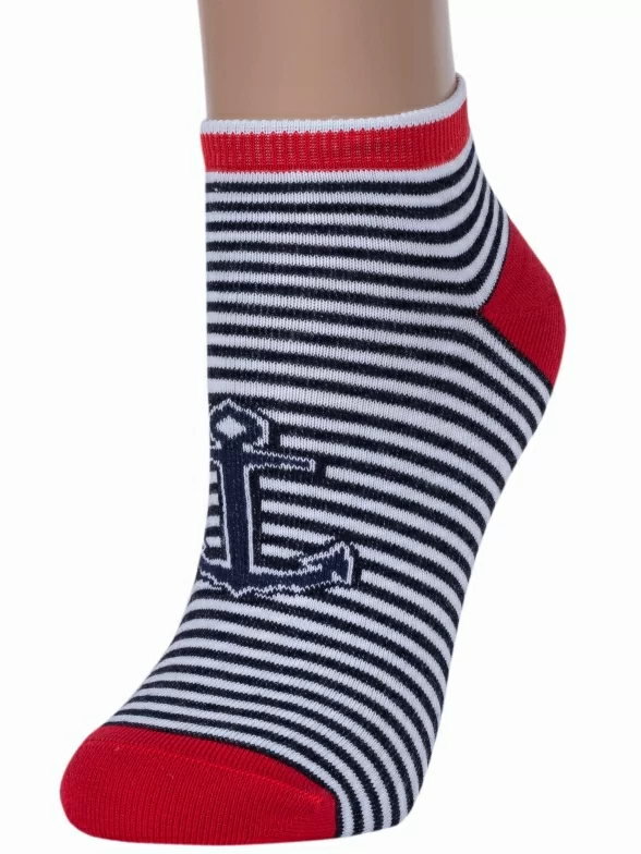 Морской стиль — это вечный летний тренд. И не важно где вы сейчас находитесь, дома, на даче или в путешествии. Такие носки обязательно заставят вас вспомнить приятный морской воздух и белоснежных барашков, за которыми так приятно наблюдать. Модель в белую и синюю горизонтальные полоски связана из мягкого хлопка с добавлением полиамида и эластана. Спереди — крупный принт в виде якоря. Мысок, пятка и широкая плоская резинка сделаны из нити контрастного красного цвета.