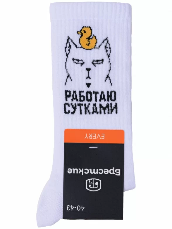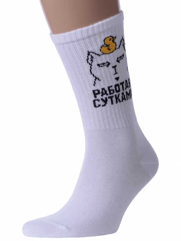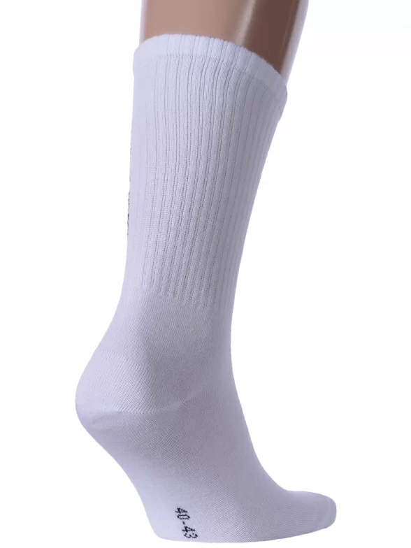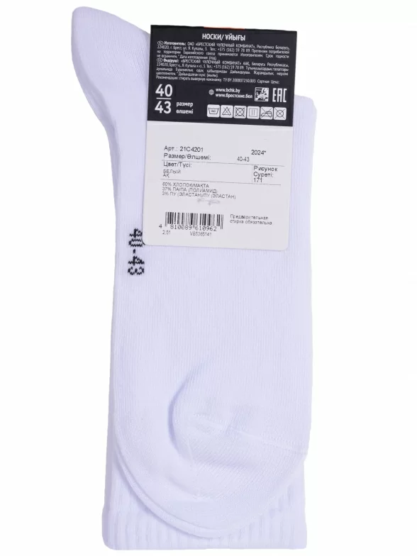 Круглогодичные средней длины носки унисекс, цвет белый, спортивные, шов обычный (не бесшовные), принт (рисунок): надписи, в рубчик, состав: 60% хлопок, 37% полиамид, 3% эластан, арт. 21С4201. Производитель «Брестский чулочный комбинат ОАО, Беларусь» под брендом «Брестские (бчк)».