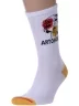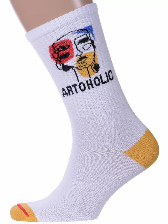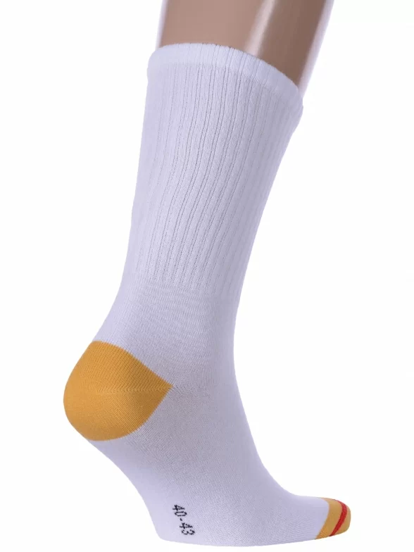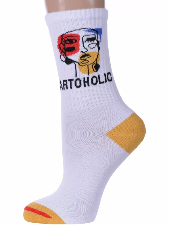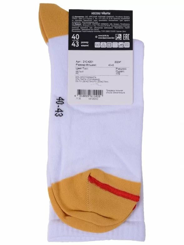 Круглогодичные средней длины носки унисекс, цвет белый, спортивные, шов обычный (не бесшовные), принт (рисунок): надписи, в рубчик, состав: 60% хлопок, 37% полиамид, 3% эластан, арт. 21С4201. Производитель «Брестский чулочный комбинат ОАО, Беларусь» под брендом «Брестские (бчк)».