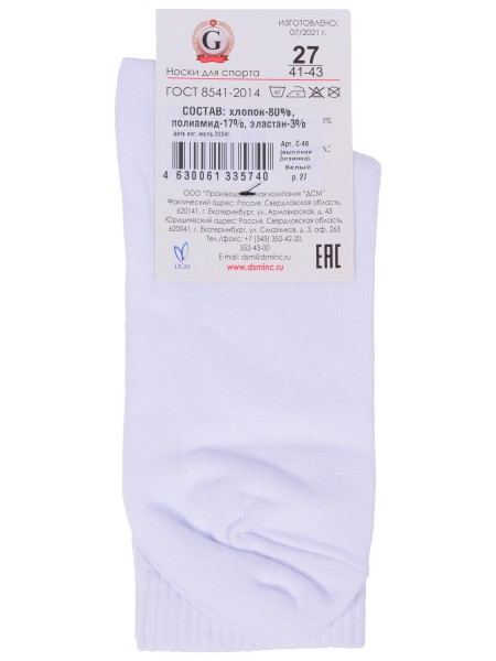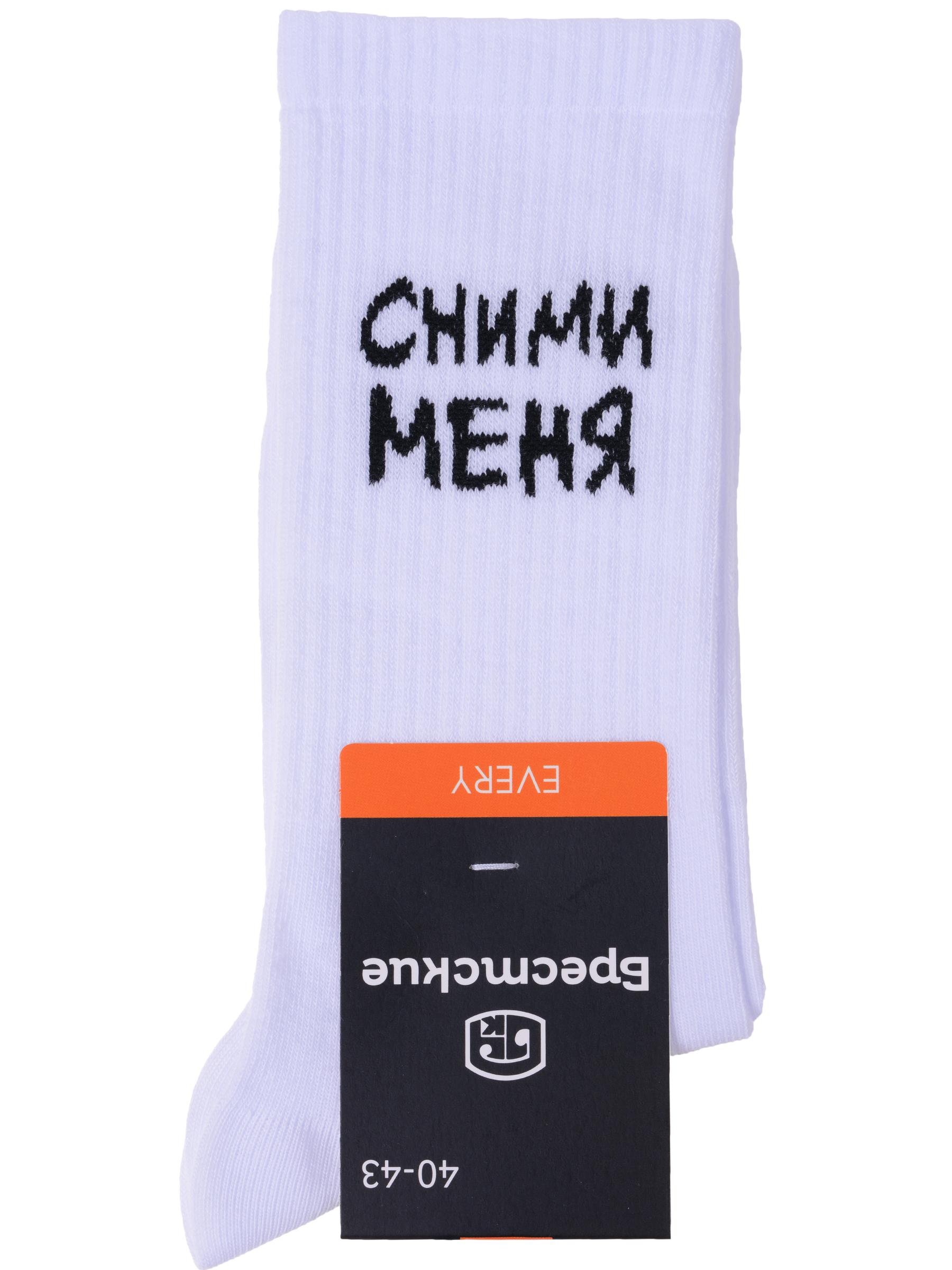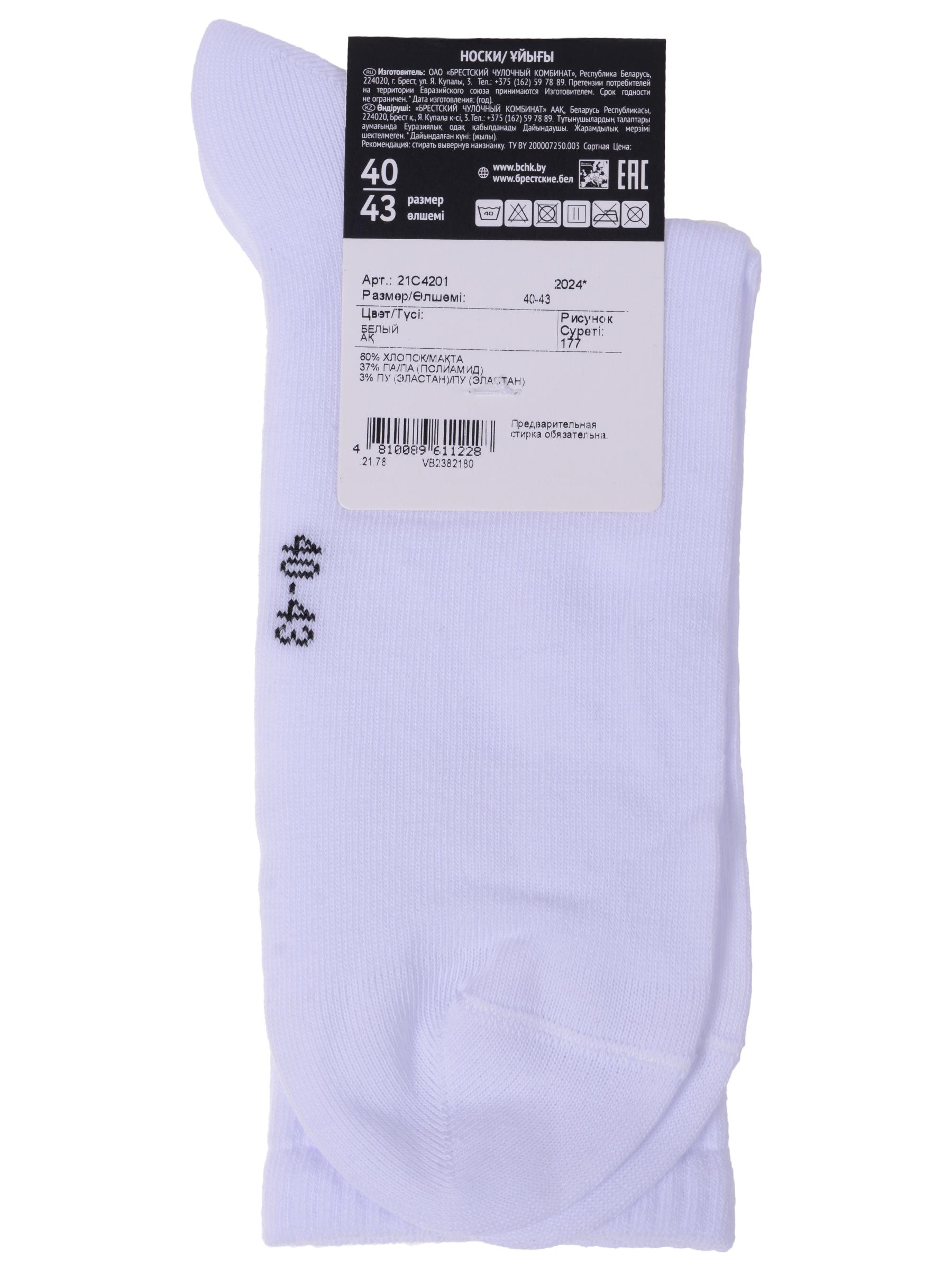 Круглогодичные средней длины носки унисекс, цвет белый, спортивные, шов обычный (не бесшовные), принт (рисунок): надписи, в рубчик, состав: 60% хлопок, 37% полиамид, 3% эластан, арт. 21С4201. Производитель «Брестский чулочный комбинат ОАО, Беларусь» под брендом «Брестские (бчк)».