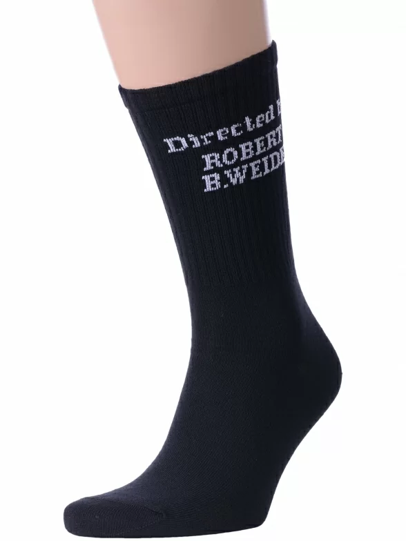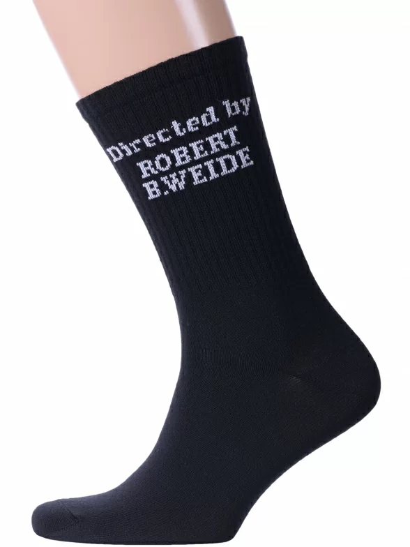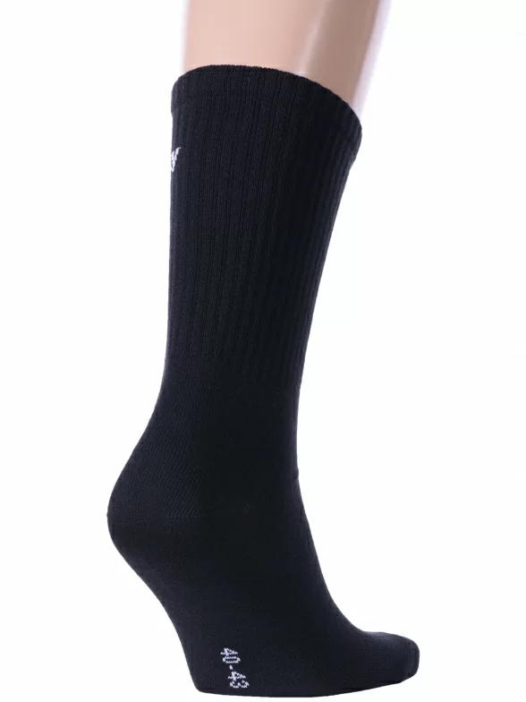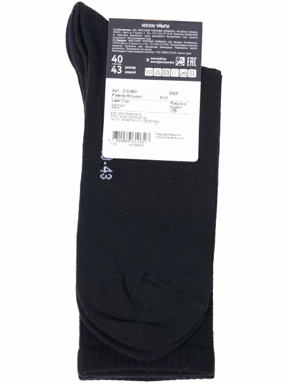 Круглогодичные средней длины носки унисекс, цвет черный, спортивные, шов обычный (не бесшовные), принт (рисунок): надписи, в рубчик, состав: 60% хлопок, 37% полиамид, 3% эластан, арт. 21С4201. Производитель «Брестский чулочный комбинат ОАО, Беларусь» под брендом «Брестские (бчк)».