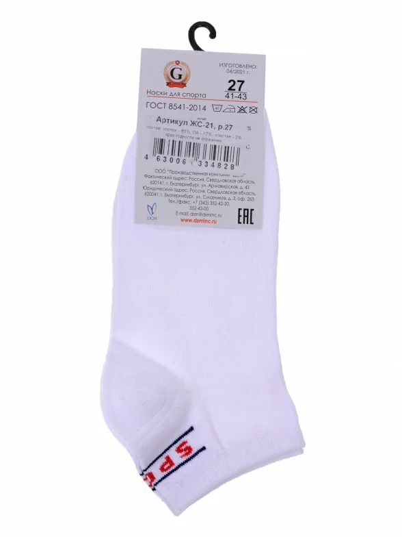 Круглогодичные короткие носки унисекс, цвет белый, спортивные, повседневные, возможно бесшовные, принт (рисунок): надписи, однотонный, небольшой рисунок, состав: 80% хлопок, 17% полиамид, 3% эластан, арт. С-ЖС-21. Производитель «ООО Производственная компания "ДСМ", Россия» под брендом «Grand line».