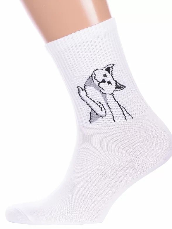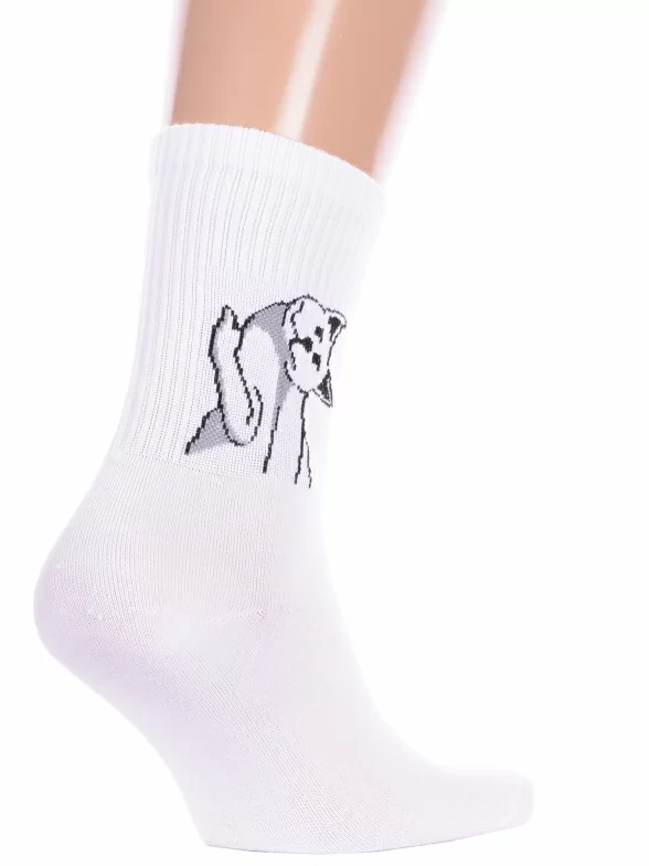 Круглогодичные средней длины носки унисекс, цвет белый, спортивные, повседневные, возможно бесшовные, принт (рисунок): животные, с узором, состав: 75% хлопок, 23% полиамид, 2% эластан, арт. Нус80159-01-32-03. Производитель «Китай, страна бренда - Россия» под брендом «Hobby line».