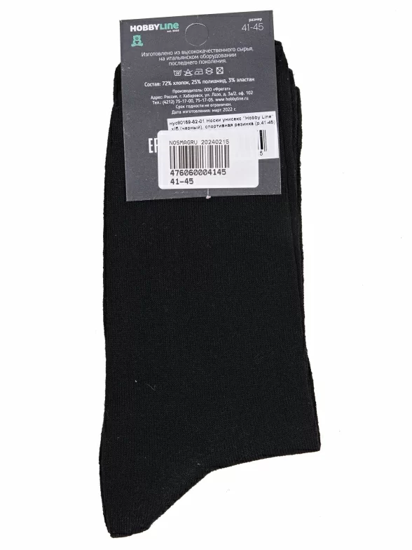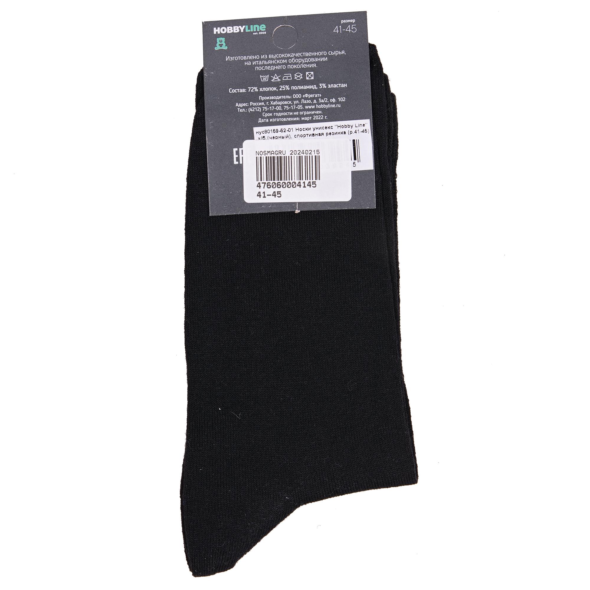 Круглогодичные средней длины носки унисекс, цвет черный, спортивные, возможно бесшовные, принт (рисунок): однотонный, без рисунков/узоров, состав: 72% хлопок, 25% полиамид, 3% эластан, арт. Нус80159-52-01. Производитель «Китай, страна бренда - Россия» под брендом «Hobby line».