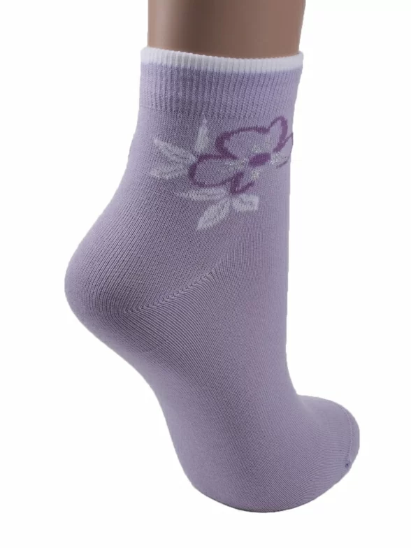 Женские носки из приятного трикотажа с высоким содержанием хлопка. Они отличаются удобной резинкой, не передавливающей кожу и обеспечивающей идеальную фиксацию на ноге. Контрастную резинку подчеркивает цветочный рисунок.